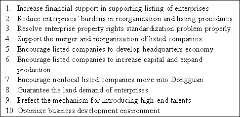 The “Ten Measures of Dongguan” also encouraged the immigration of nonlocal listed enterprises. It is explicitly stipulated that nonlocal enterprises that have registered and immigrated in Dongguan for a whole year can acquire an award of RMB 10 million.